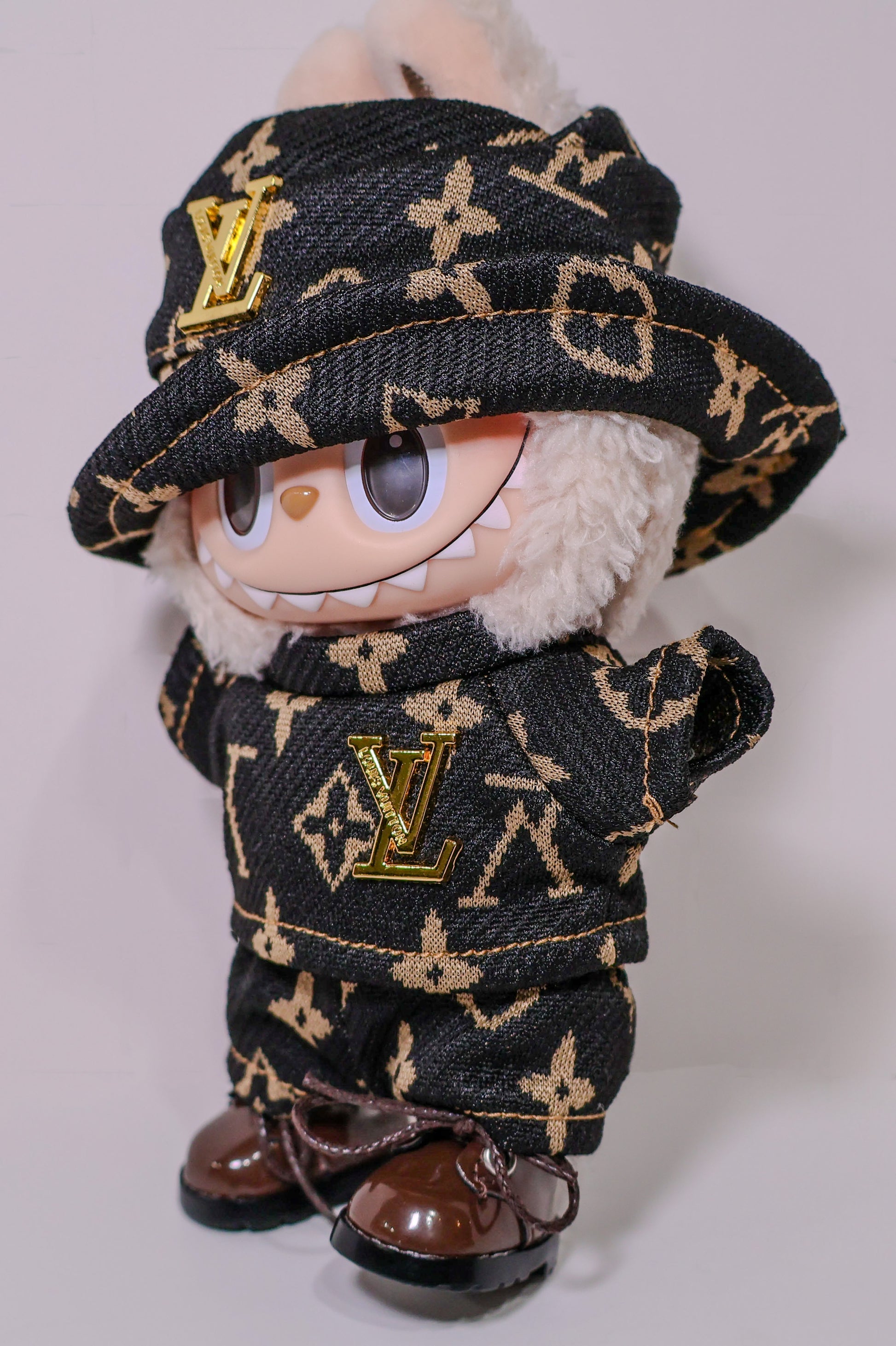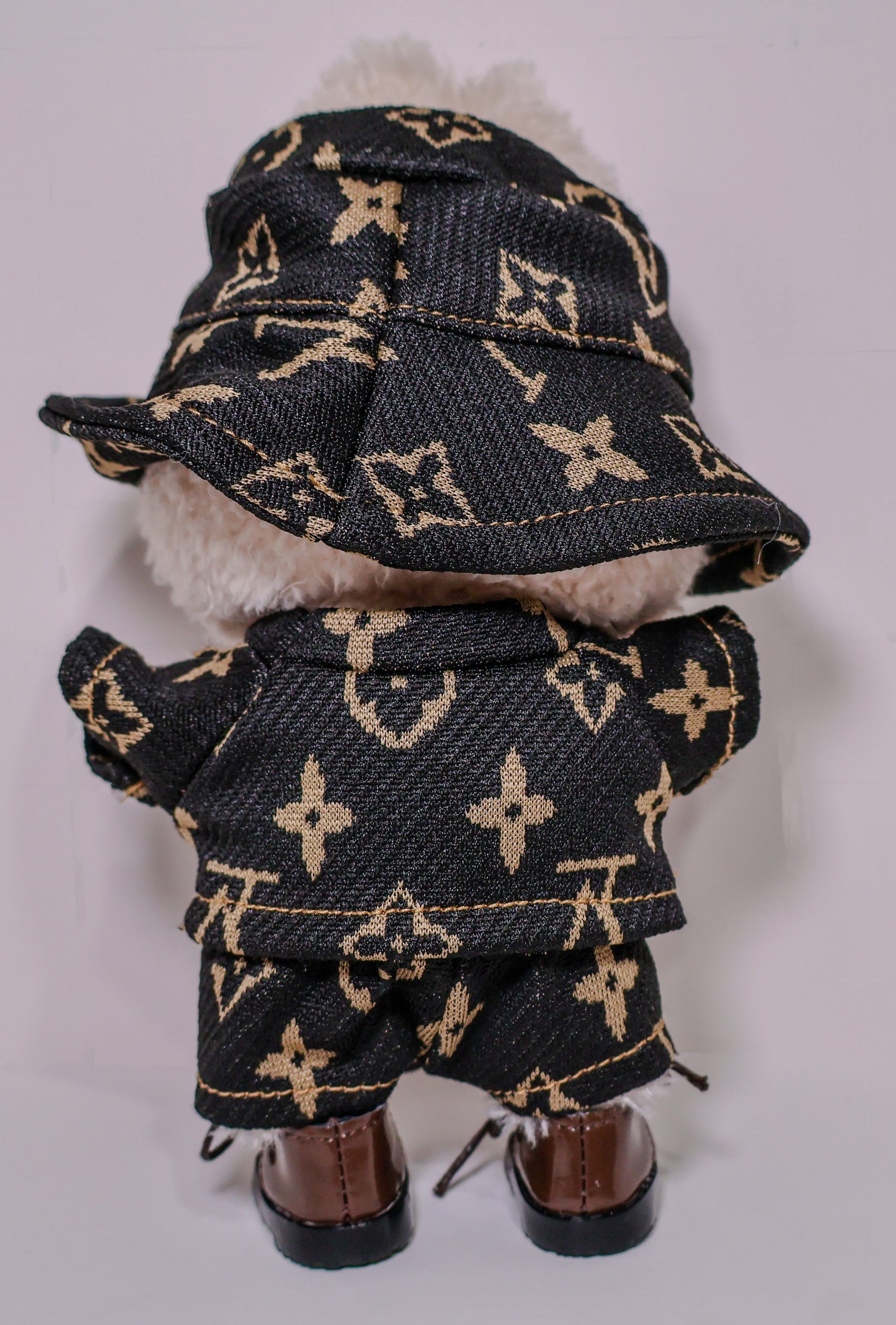Turn your Labubu into the ultimate streetwear icon with this bold black monogram outfit set. Designed with a coordinated top, pants, and bucket hat, the look is finished with statement gold details that bring high-fashion energy in collectible form. It’s the perfect outfit for plushes that demand attention.