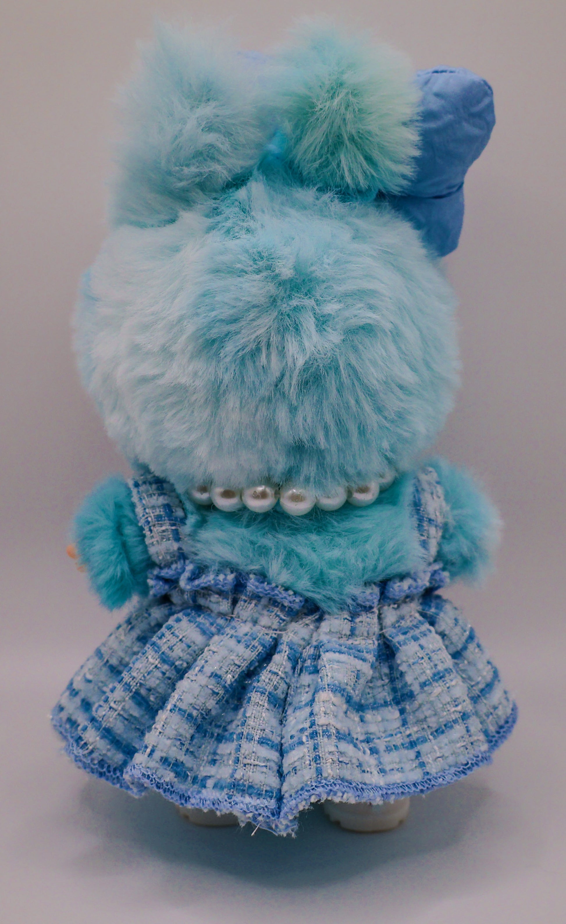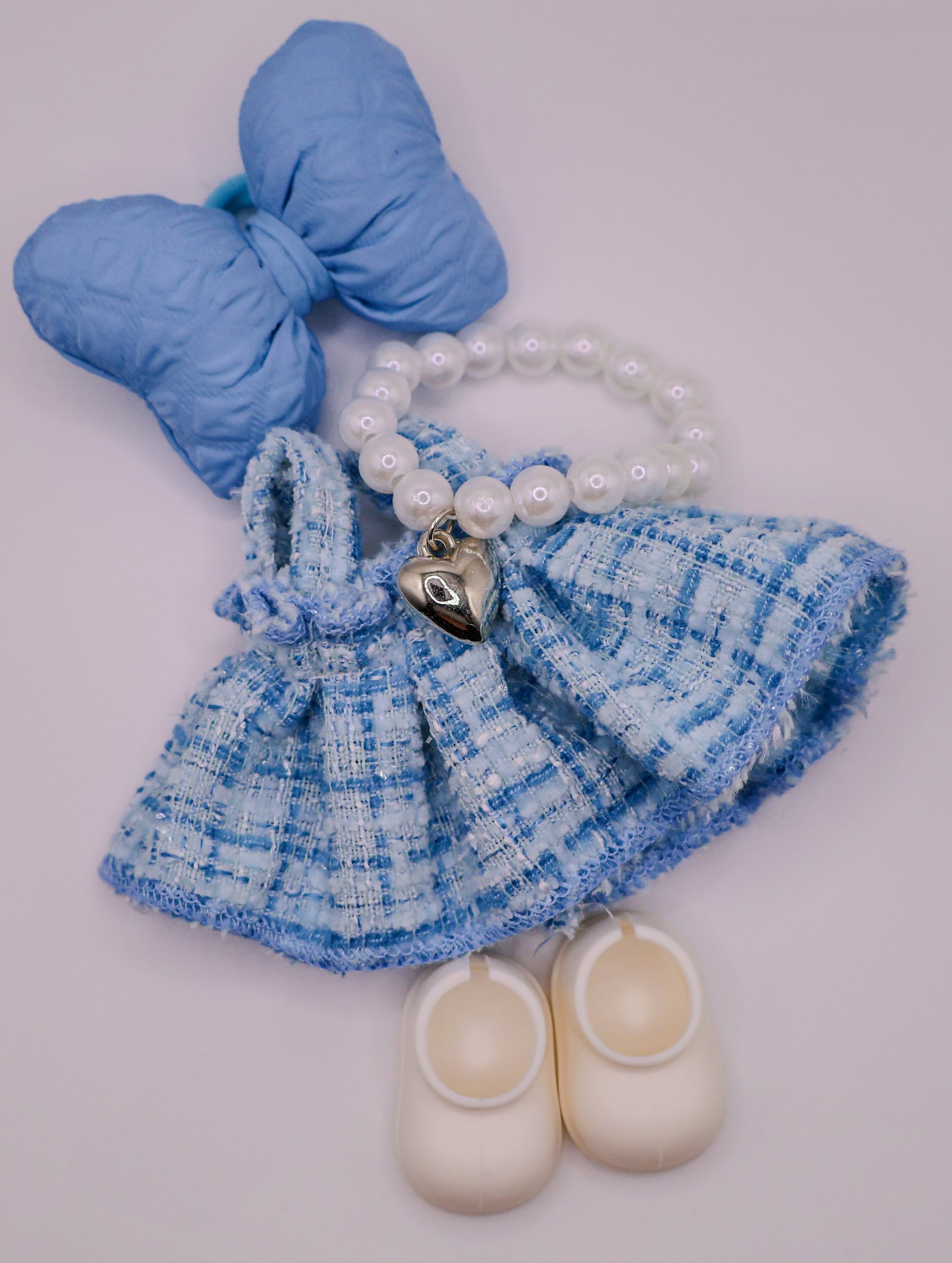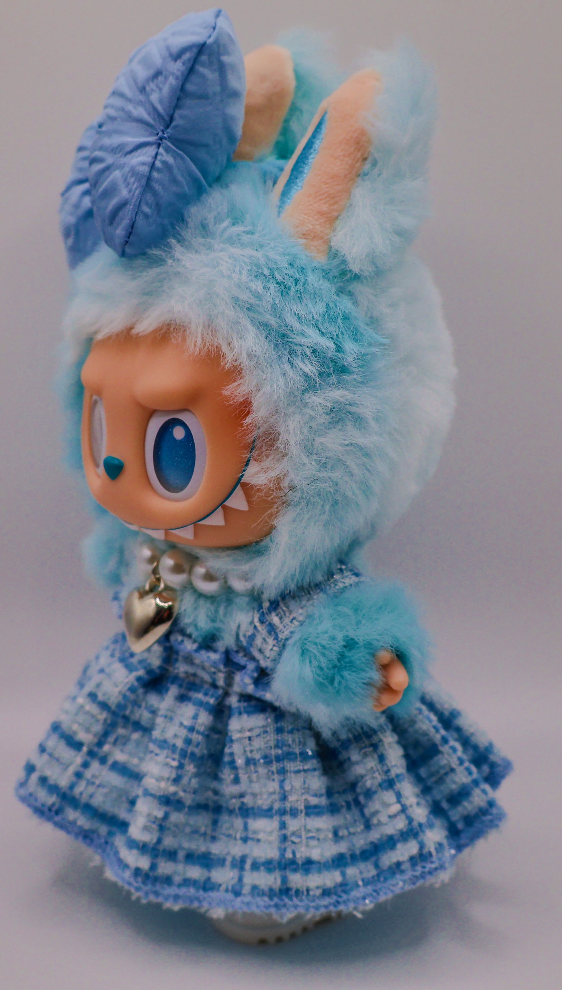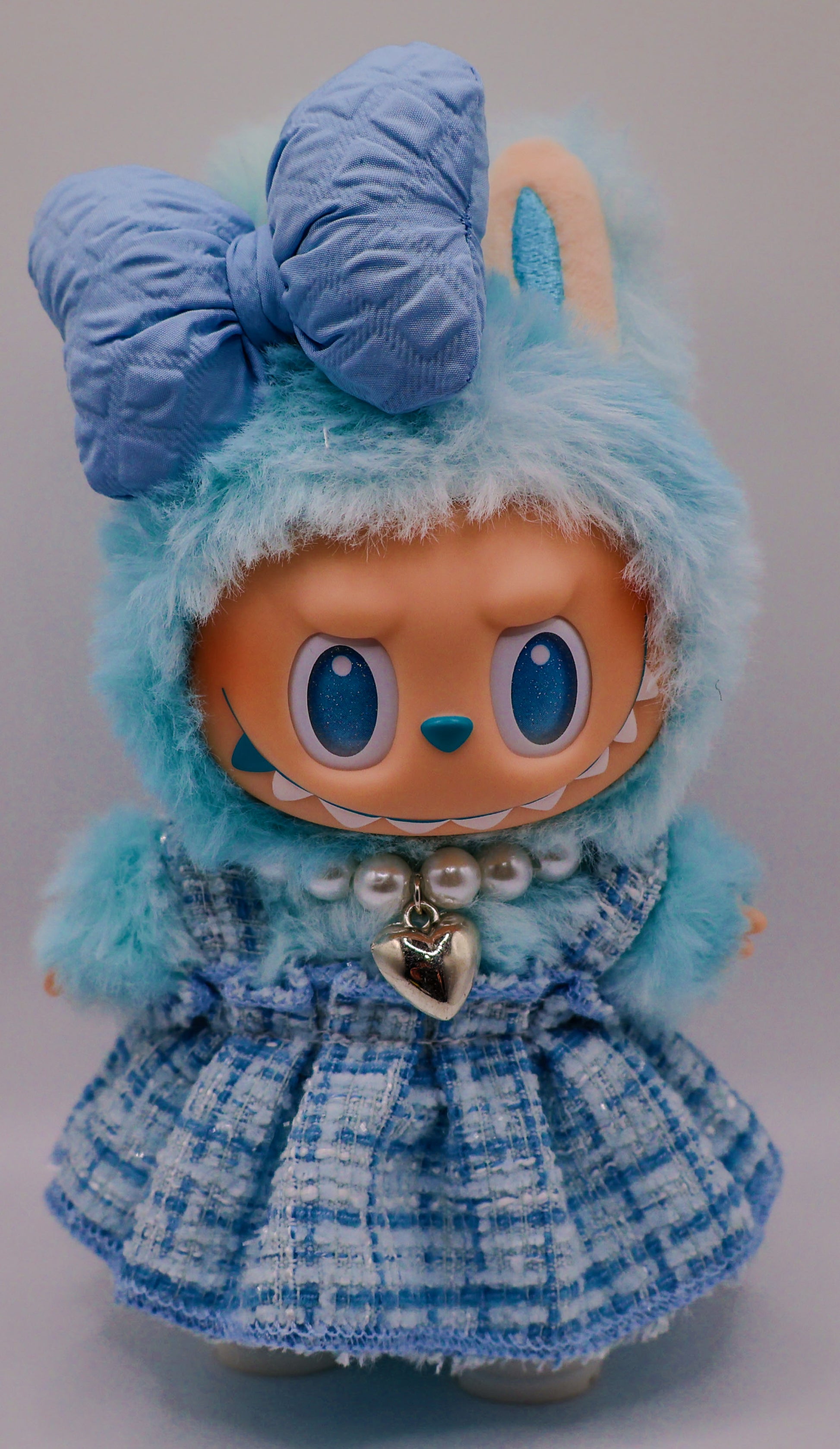 Dress your Labubu in chic elegance with the Blue Tweed Bow Outfit Set! Featuring a stylish blue tweed dress, oversized matching bow, pearl necklace with silver heart pendant, and dainty doll shoes, this outfit is the perfect blend of classy and cute.
