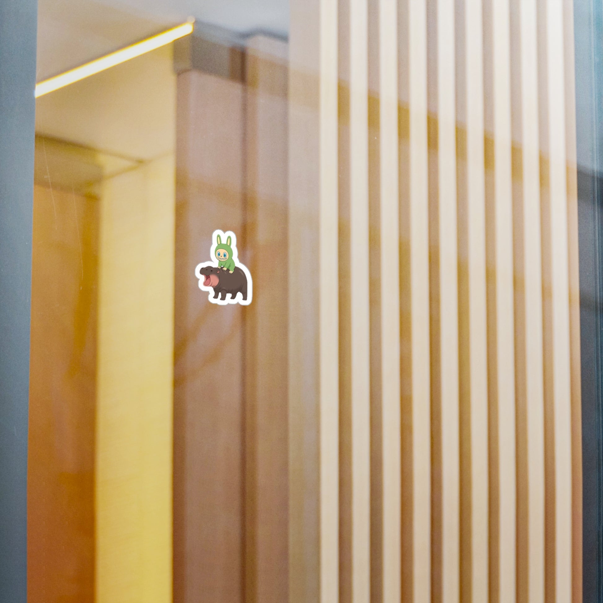 This sticker shows a mischievous green-suited character confidently riding a yawning hippo, perfectly capturing the chaotic calm before the shrimp drop storm. Use it when you’re rolling into TTL with main character energy—ready to grab everything before anyone else blinks.