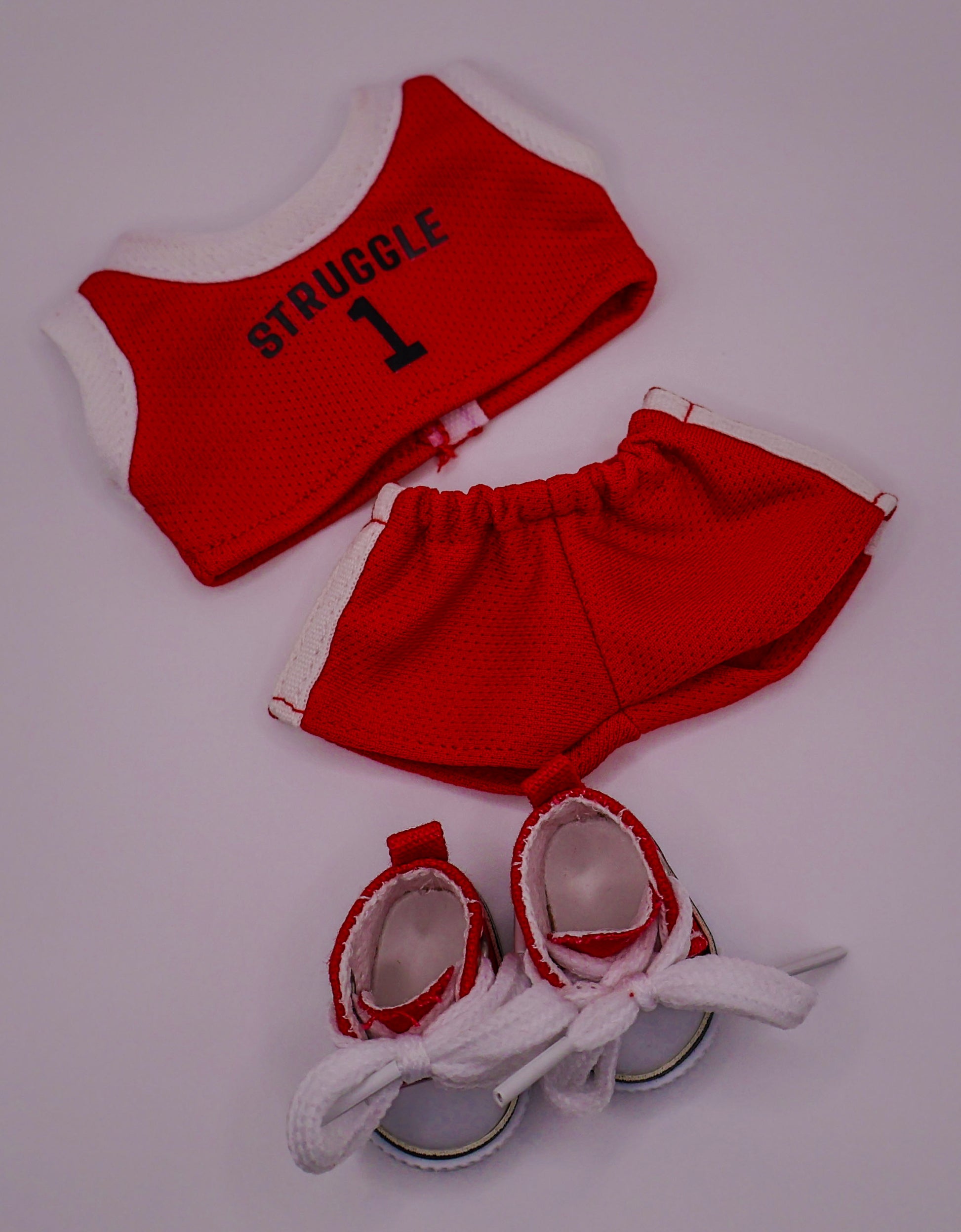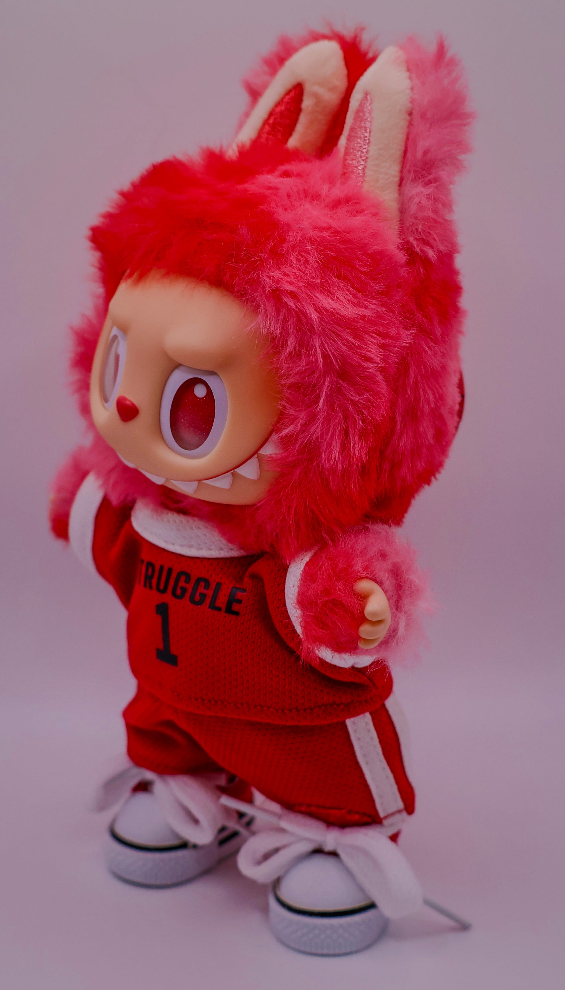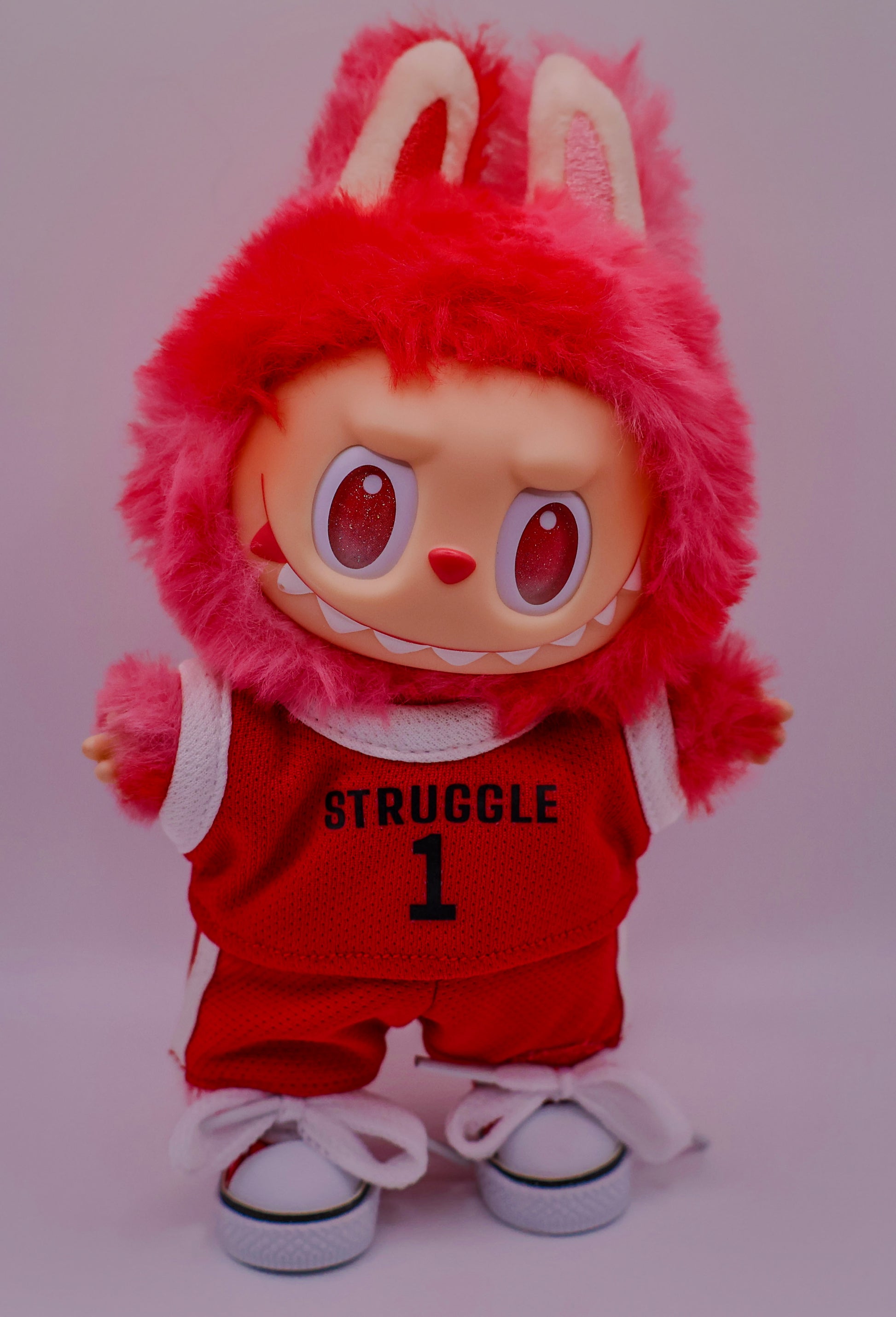 Bring game-day energy to your Labubu collection with the Red Basketball Jersey Outfit Set! Featuring a bold red jersey with “STRUGGLE 1” print, matching shorts, and sporty sneakers, this outfit is perfect for collectors who love a touch of athletic style.