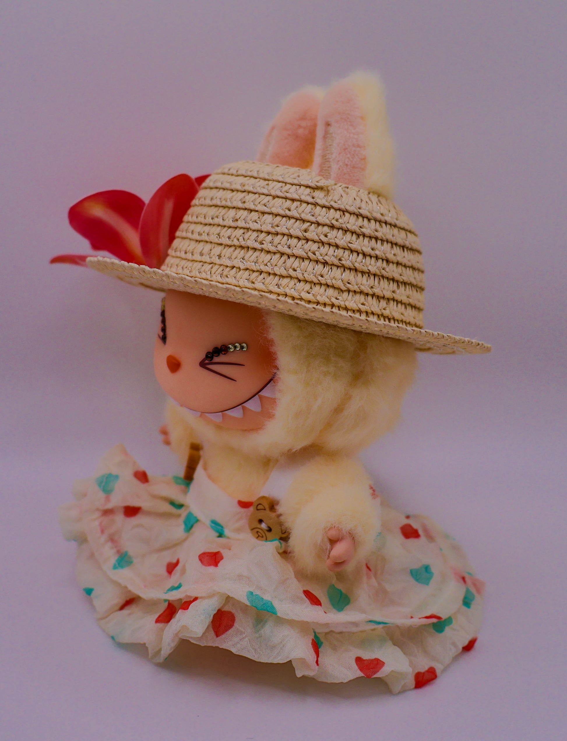 Brighten your collection with the Yellow Summer Labubu! Featuring a straw sunhat adorned with a tropical flower and a layered teddy bear dress, this outfit brings golden sunshine energy to your display. A must-have for collectors who love playful yet stylish designs.